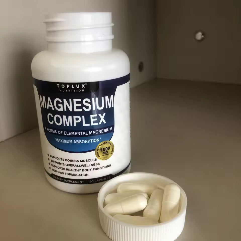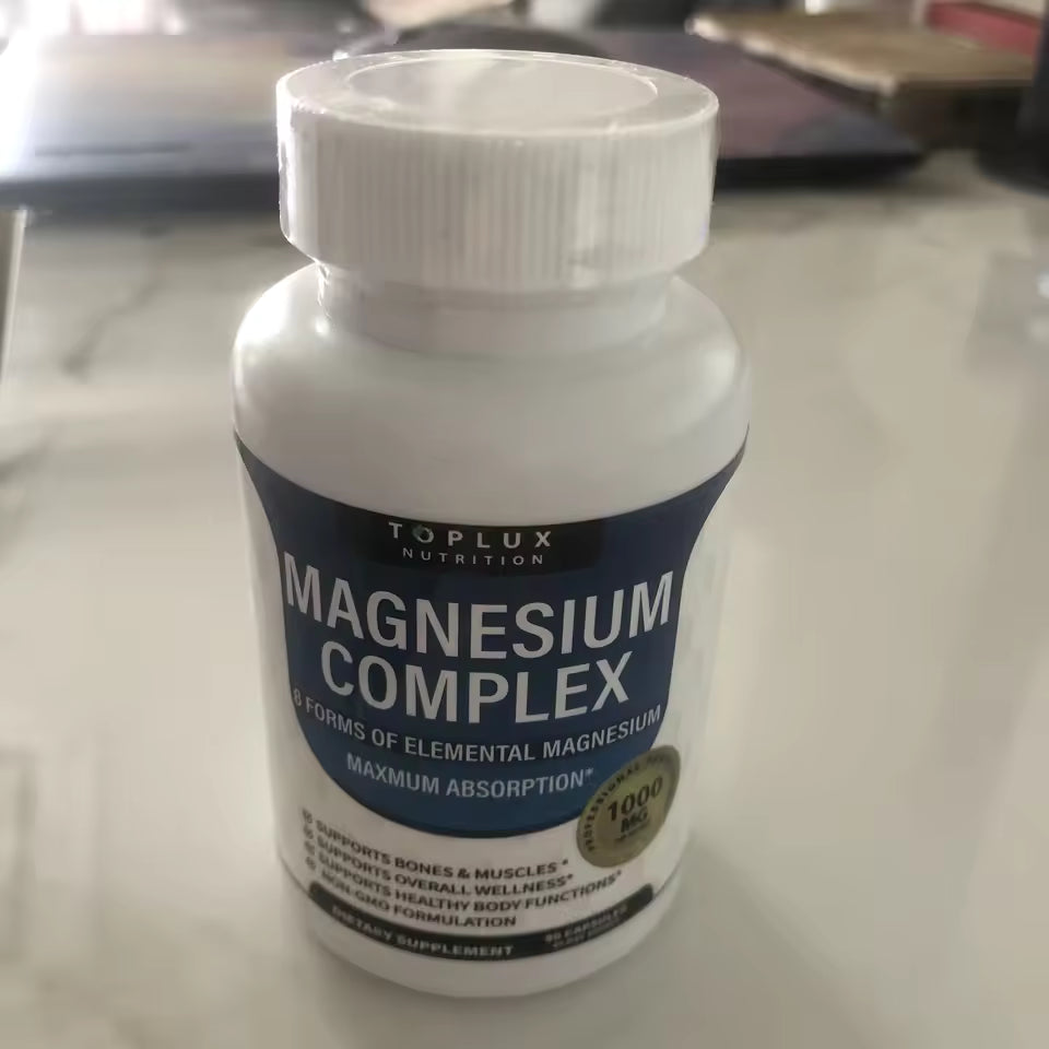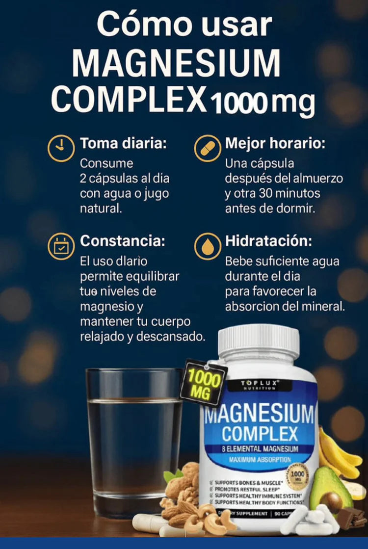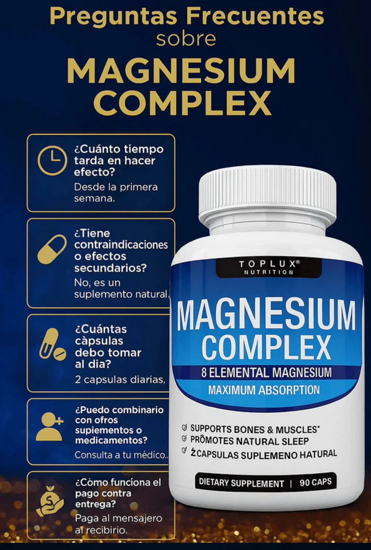 Este Complejo de Magnesio Multifuente Toplux combina 8 tipos de magnesio altamente absorbibles, diseñados para mejorar tu descanso, fortalecer tus músculos y potenciar tu energía diaria.